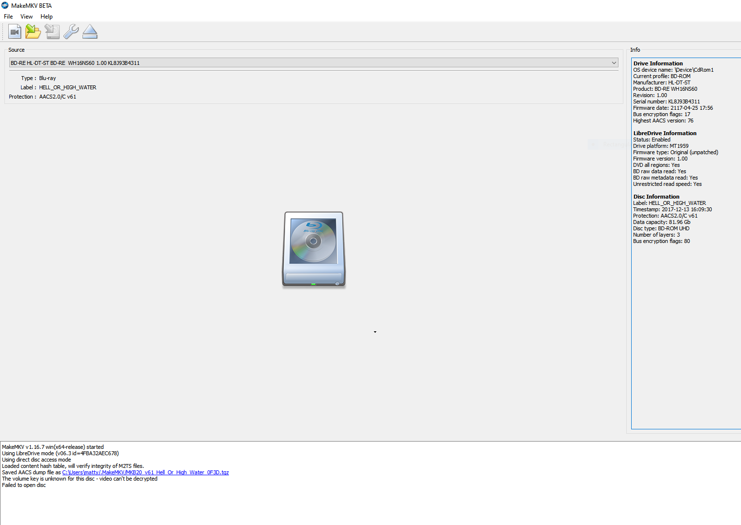 Trying to backup hell or high water uhd us disc. Got the message that the volume is unknown which i thought was strange since the disc was released in 2018. Sent the dump file to svq@makemkv.com on 4th April but still getting the same message.