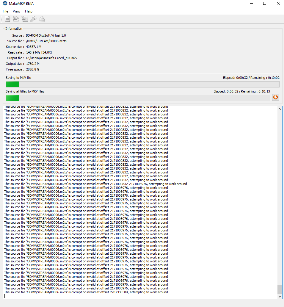 I'm getting an error when trying to get the main feature though MakeMKV. But I've played the main feature with PowerDVD and VLC all the way though without any issues. So I'm not sure if this is a disc issue or not. Any ideas?