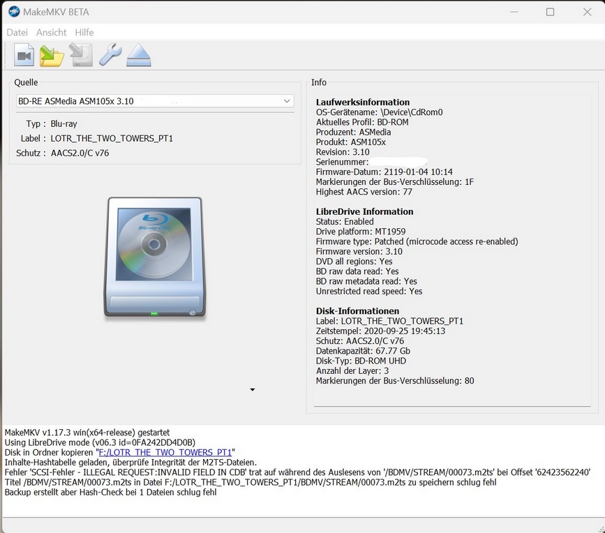 Unable to backup LOTR extended UHD, Two Towers part 1