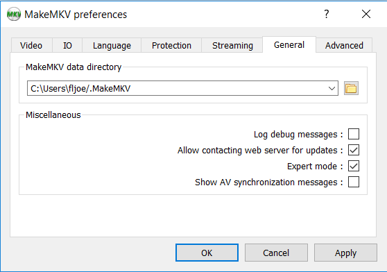 Does "View -> Preferences -> General" show the above data directory? Mine was set in Users .. hence the question ...d4thev wrote:I mean as far as the hashed keys are concerned I am simply putting the text file of the hashed keys in the folder where MakeMKV has designated the data directory right? In my case the data directory is "D:/Program Files (x86)/MakeMKV" so I just have the txt file of the hashed keys in there. Cleanliness of the disk it is brand new, just opened, looks spotless, but I guess I can try cleaning it.