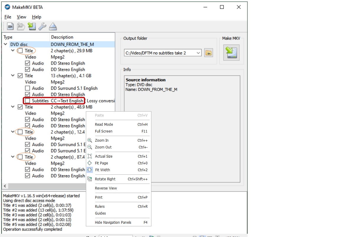After MakeMKV scans the disc we see something like this (with all the Title boxes checked):