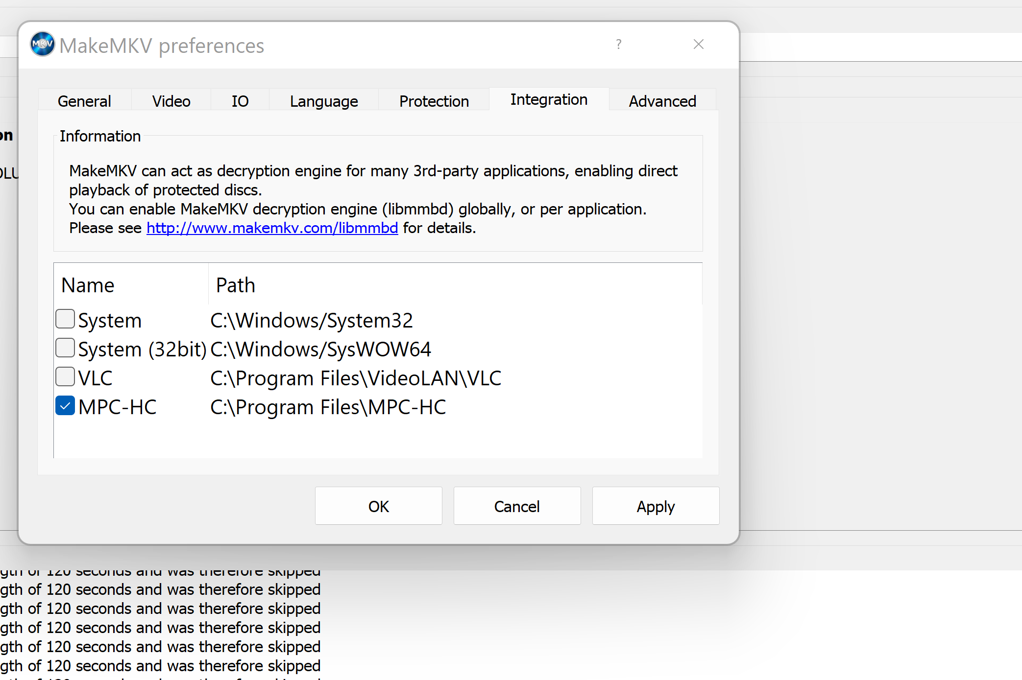 As you can see in attachments, integration is ticked and makemkv indicates that registration is on.